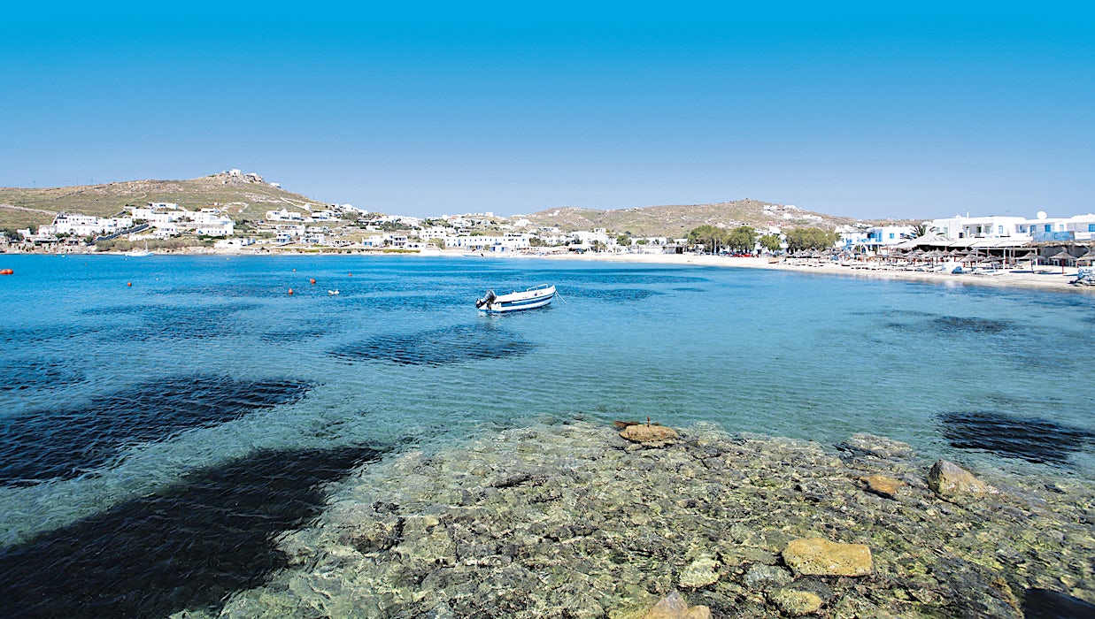 Lahden toisessa päässä on kalasatama, jossa purjeveneet kelluvat laitureissa ja taksiveneet kulkevat edestakaisin etelärannikon rantojen välillä. Hyppää veneeseen ja vietä päivä vaikka Paradise Beachillä. Voit myös lähteä veneretkelle Unescon suojelemalle Deloksen saarelle, jolla on temppelien rauniot ja patsaita antiikin Kreikan kukoistuksen ajoilta.